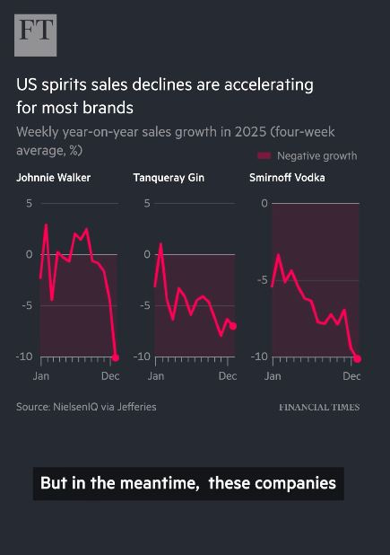 Johnnie Walker, Smirnoff, and Tanqueray each declined roughly 10% in weekly US sales through 2025. This is not a supply chain problem. It is a demand verdict.