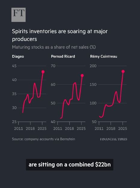 Five major spirits producers, Diageo, Pernod Ricard, Rémy Cointreau, Campari, and Brown Forman are now sitting on a combined $22 billion in unsold inventory, the highest level in over a decade. Rémy Cointreau’s maturing stock has reached approximately 185% of its annual revenues, close to its entire market capitalization. Hennessy, which commanded $45 a bottle during the pandemic, has been cut to $35. Cognac exports fell 72% year on year.